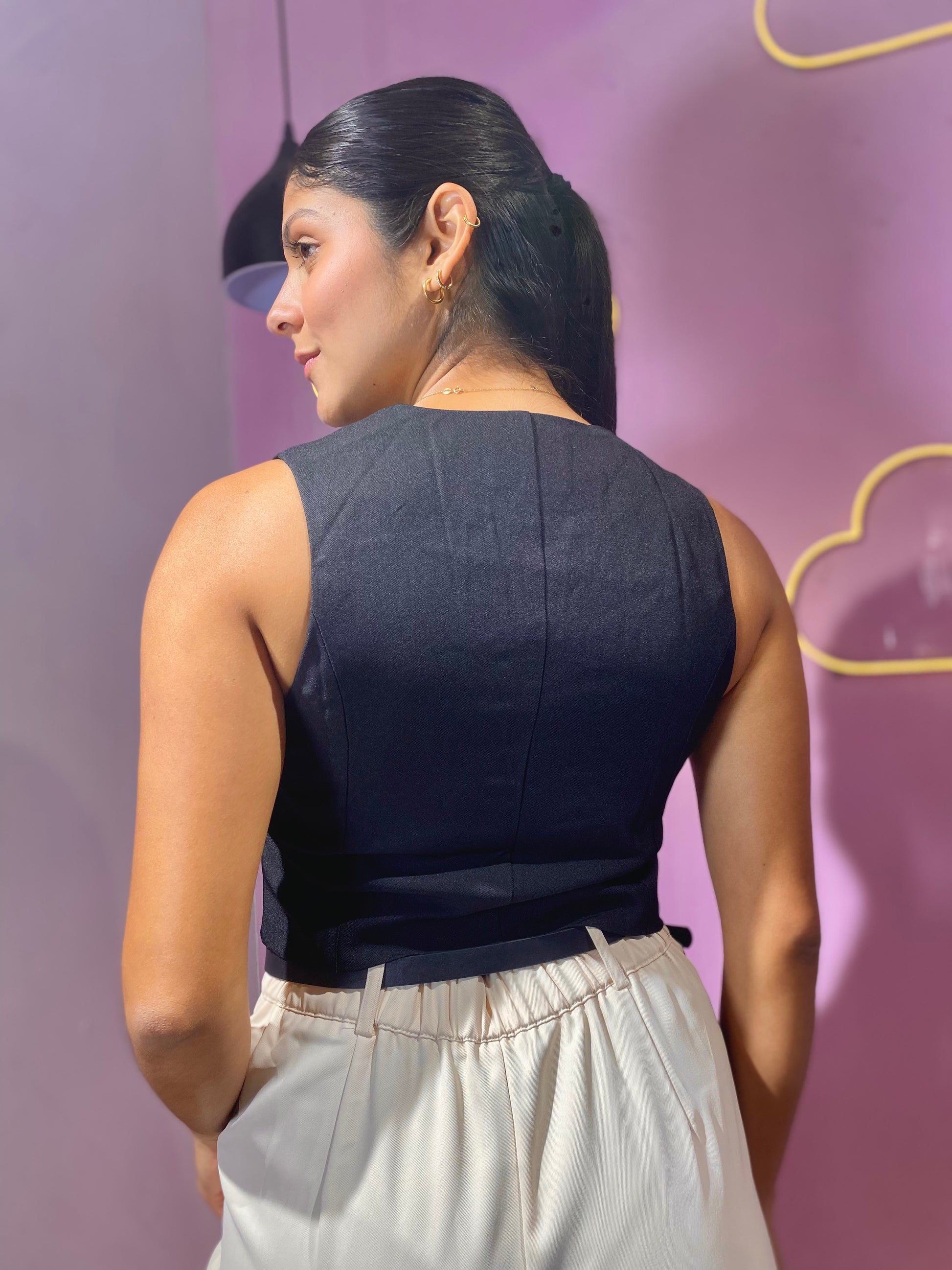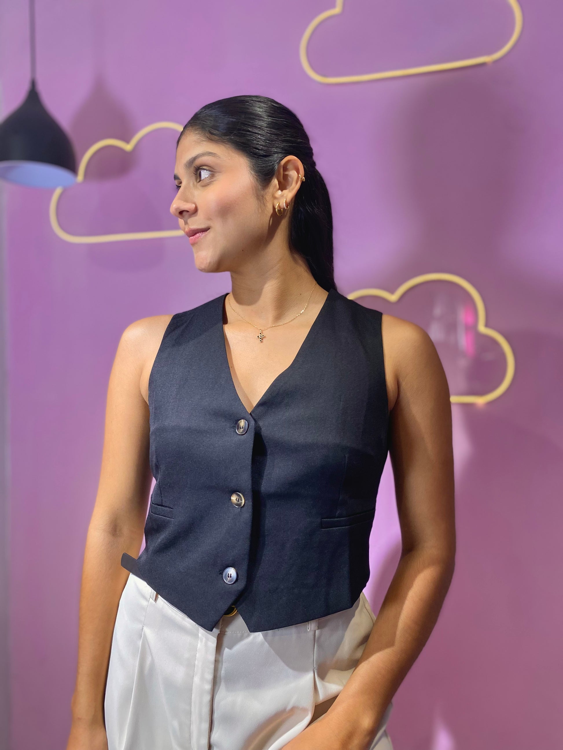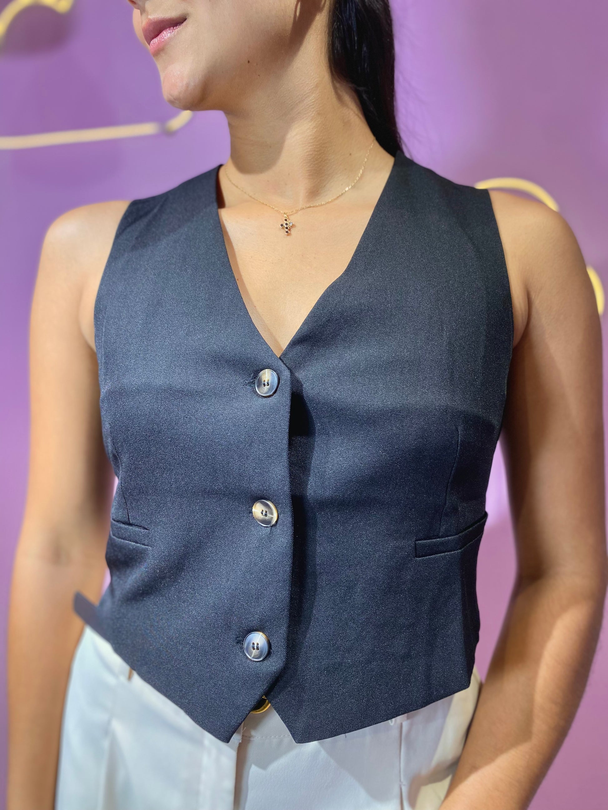 Chaleco de vestir negro de botones marrones