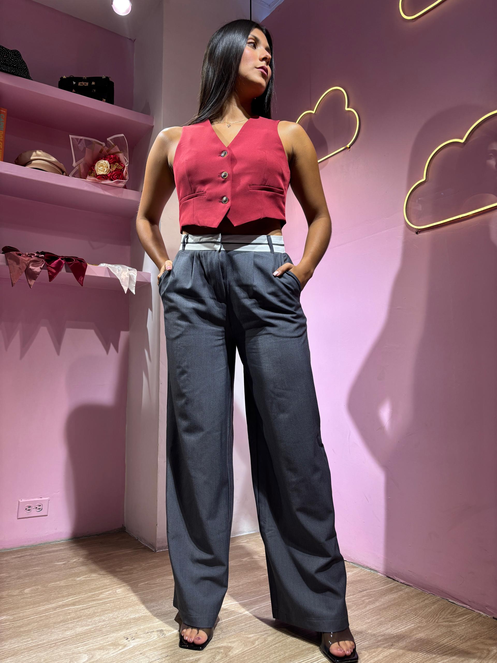 Pantalón de vestir palazzo gris con doble pretina blanca