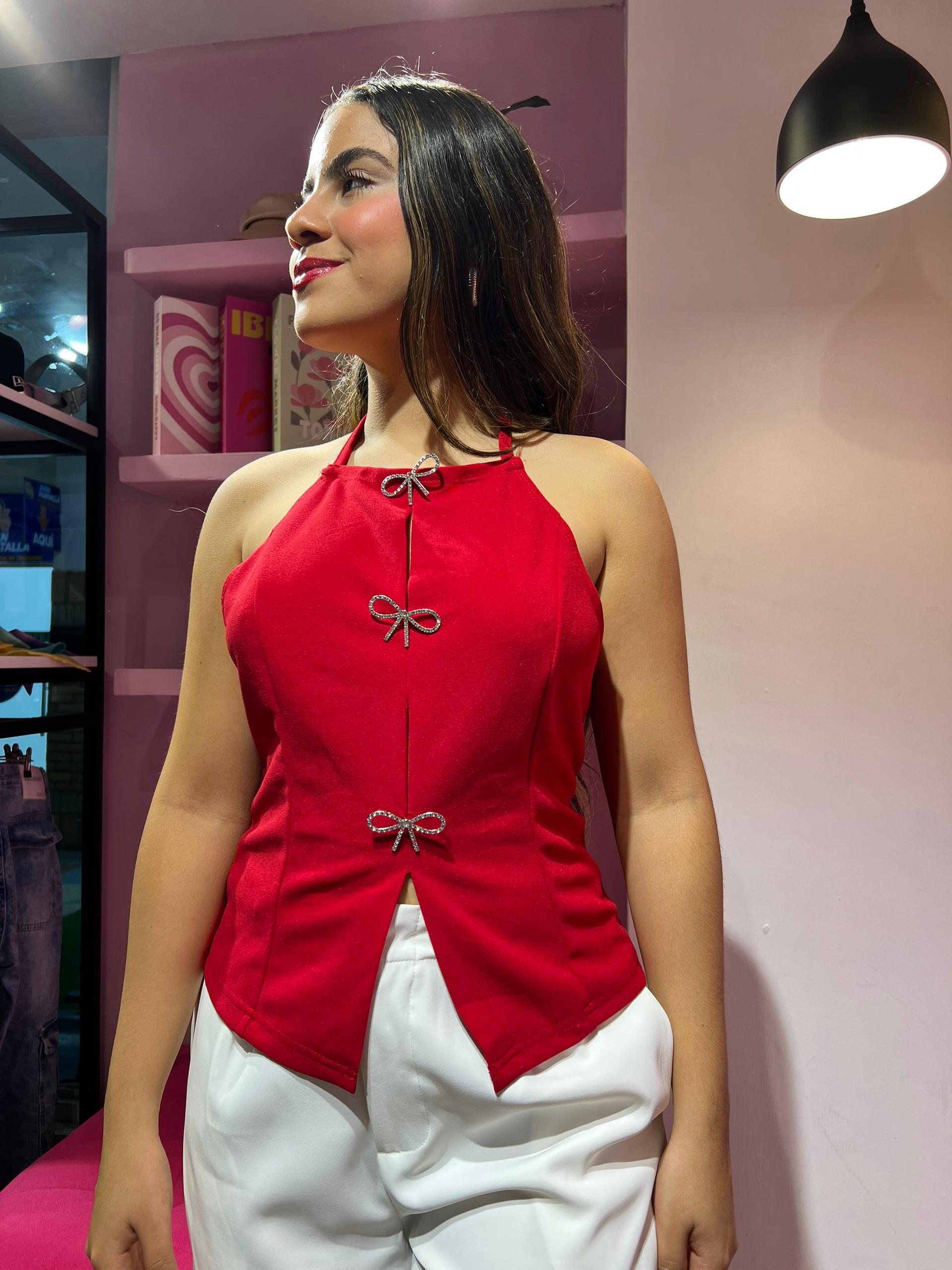 Top asimétrico de satén rojo con tirantes y lazos delanteros