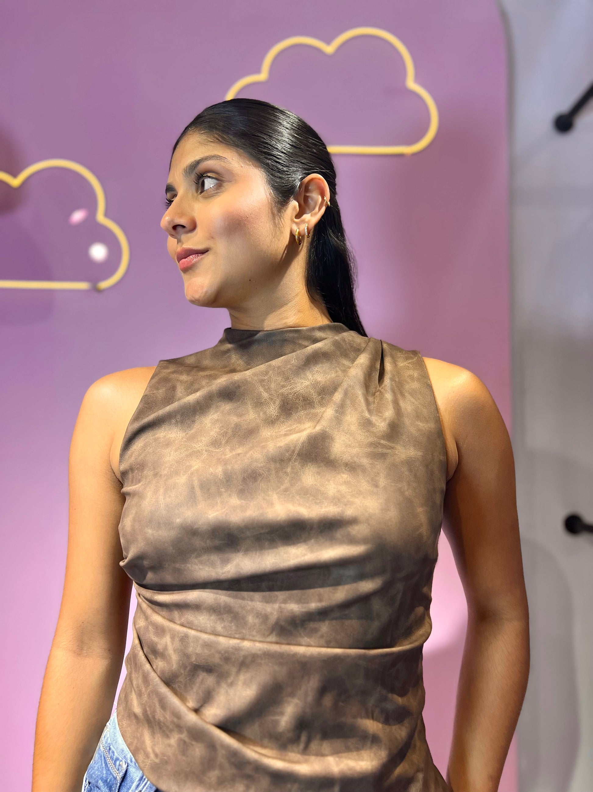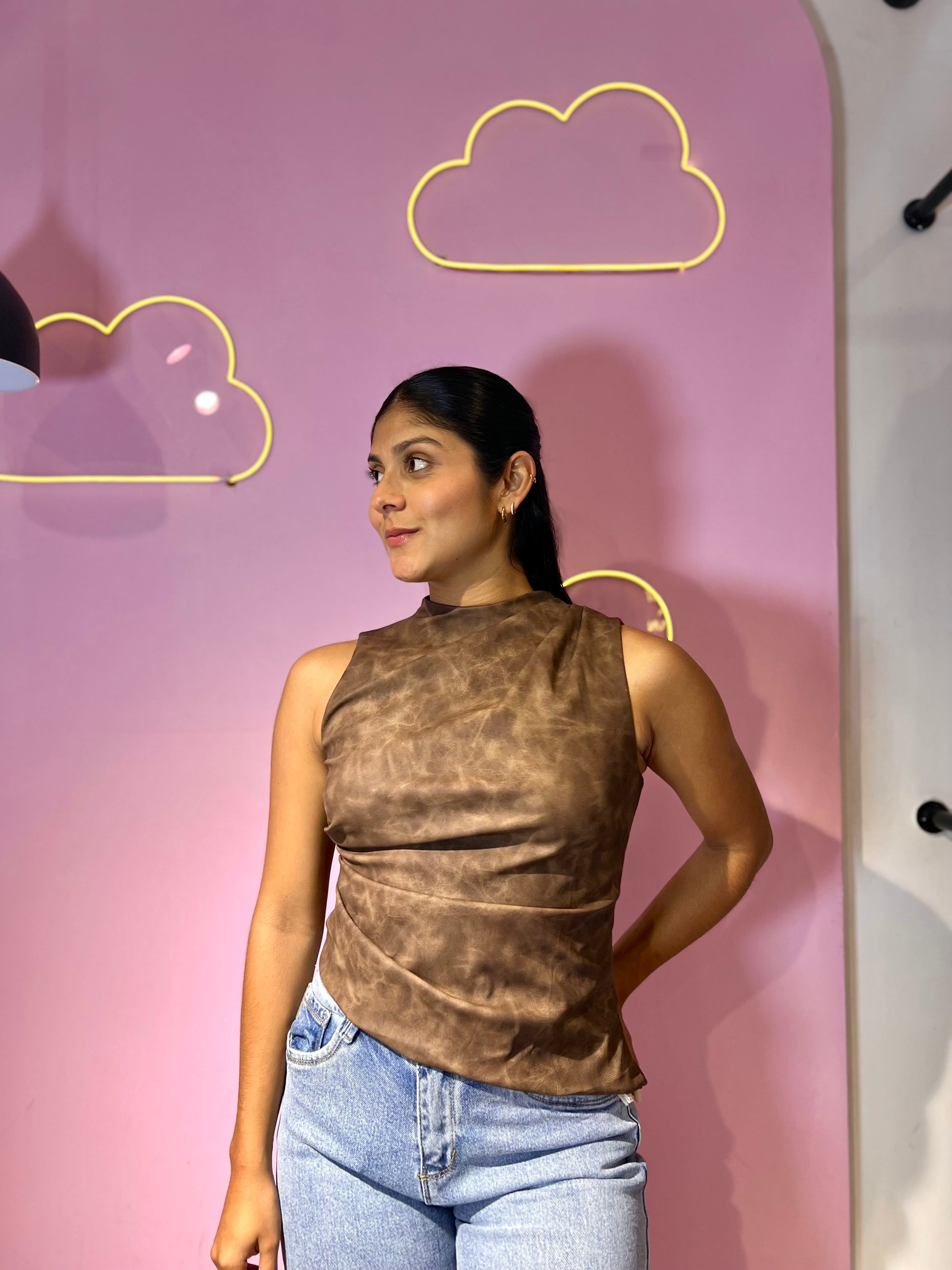 Top se cuerina cuello alto asimétrico desgastado marrón
